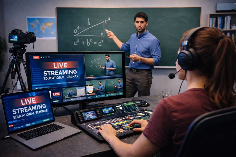 Servicio orientado a instituciones educativas para la transmisión de clases, capacitaciones y seminarios virtuales, garantizando continuidad, claridad en la transmisión y soporte técnico durante las sesiones.
